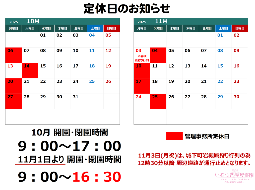 2025年10月・11月の定休日のお知らせ
