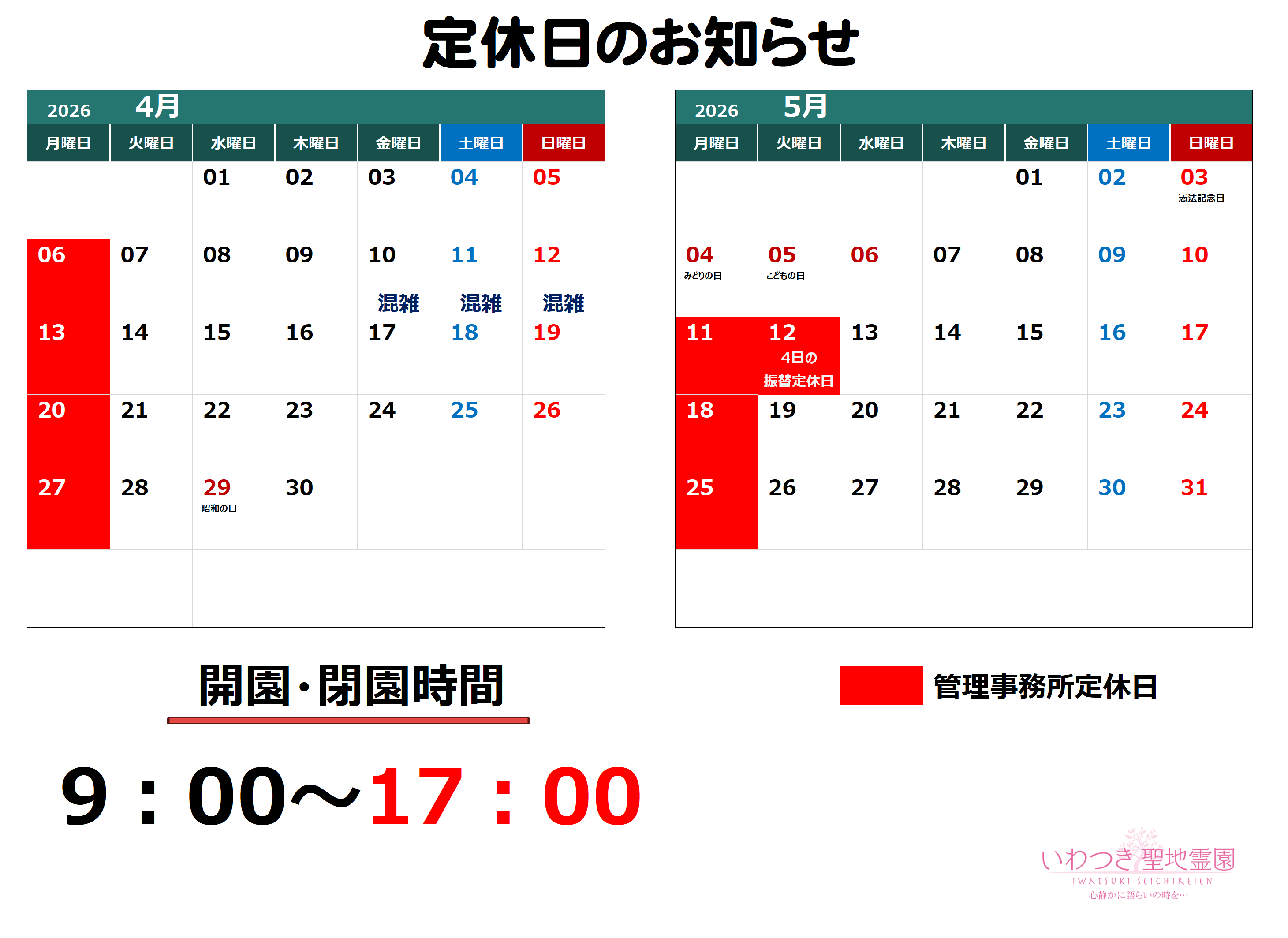 2026年4月・2026年5月の管理事務所定休日のお知らせです。